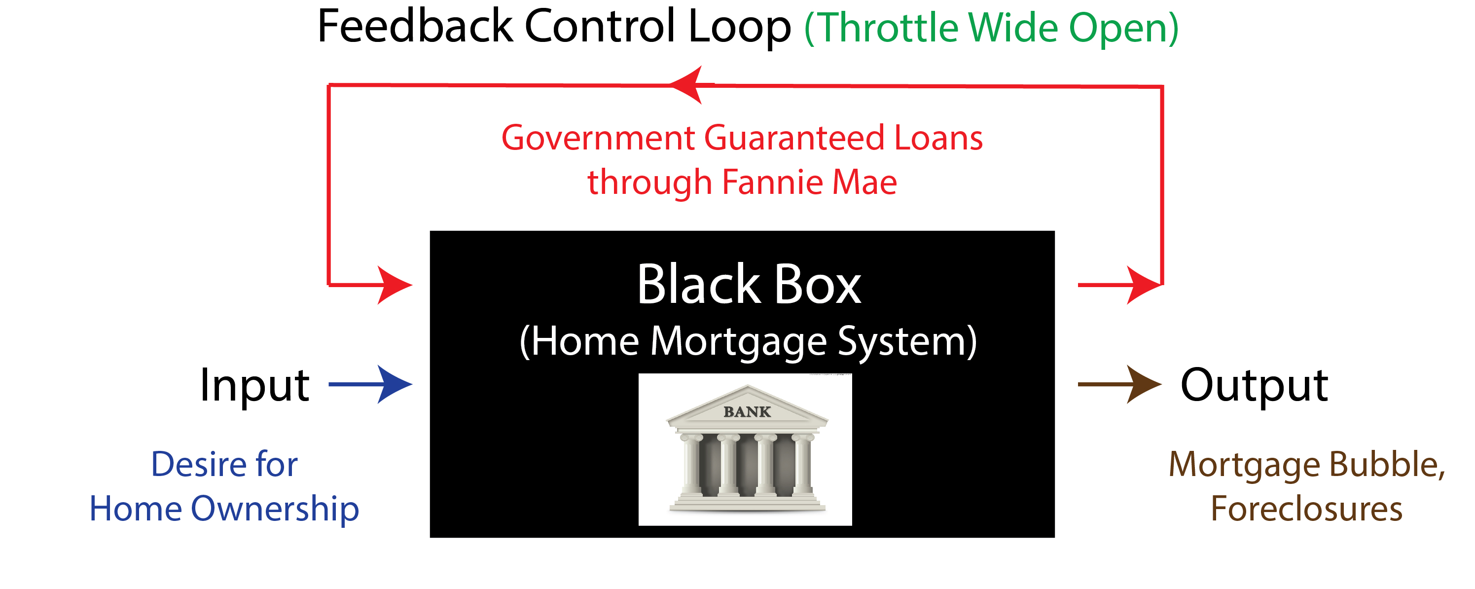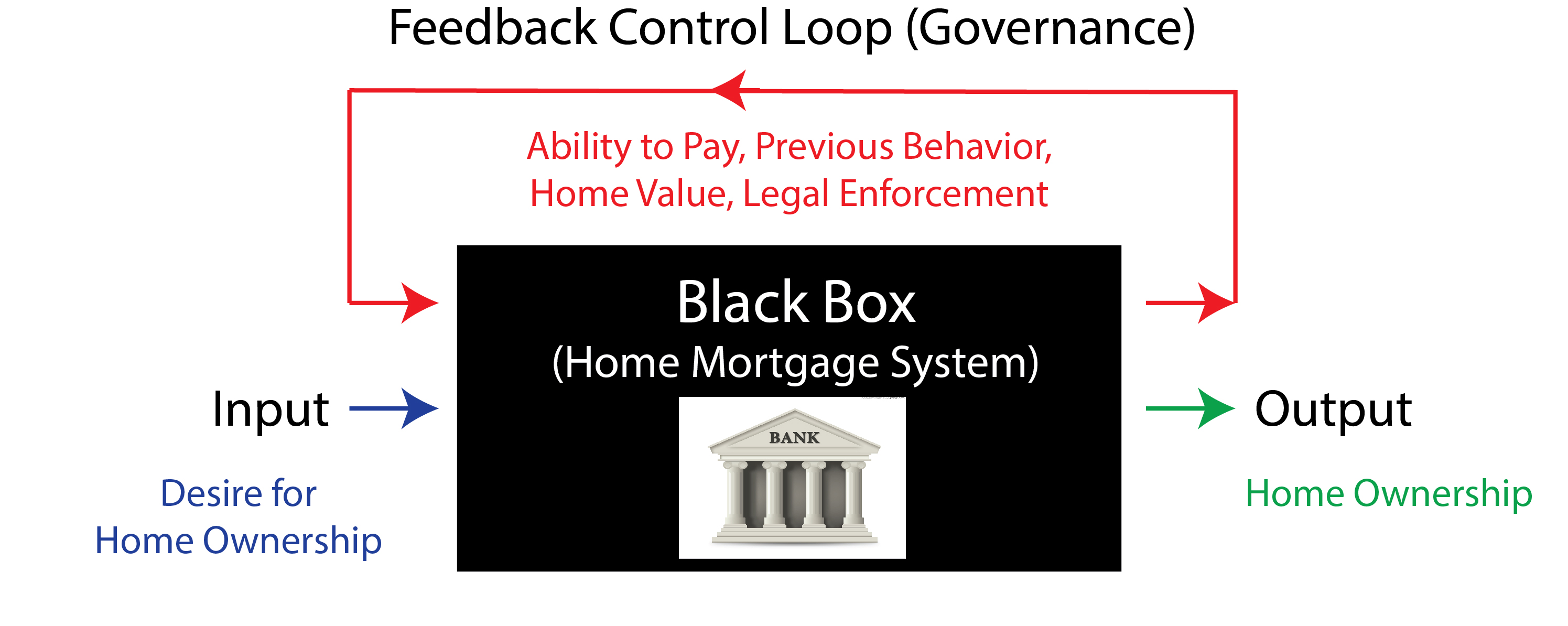 Home mortgages are a social subsystem in the economic sector. If I sell my house at market price for cash, that is a simple market transaction. However, if the buyer goes to the bank and gets a loan, and the bank pays me cash and the buyer pays the bank over time, a new economic micro-system has been established. This micro-system, the home loan, has developed sound principles of operation over centuries of lending experience, and these principles are readily known. The diagram below explains this system in a cybernetic diagram: