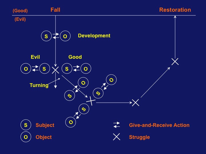 Here I am reminded of the diagram used to describe the “Law of Turning” in the Unification Thought theory of history (see Figure 1). This diagram illustrates how a united subject and object make progress in a particular direction that begins far from, even opposite to, the direction of goodness, but through a series of encounters with other subjects whose purpose and direction is closer to that of God’s, adjustments to the direction are made. Thus the direction of progress turns closer and closer toward being in alignment with goodness.