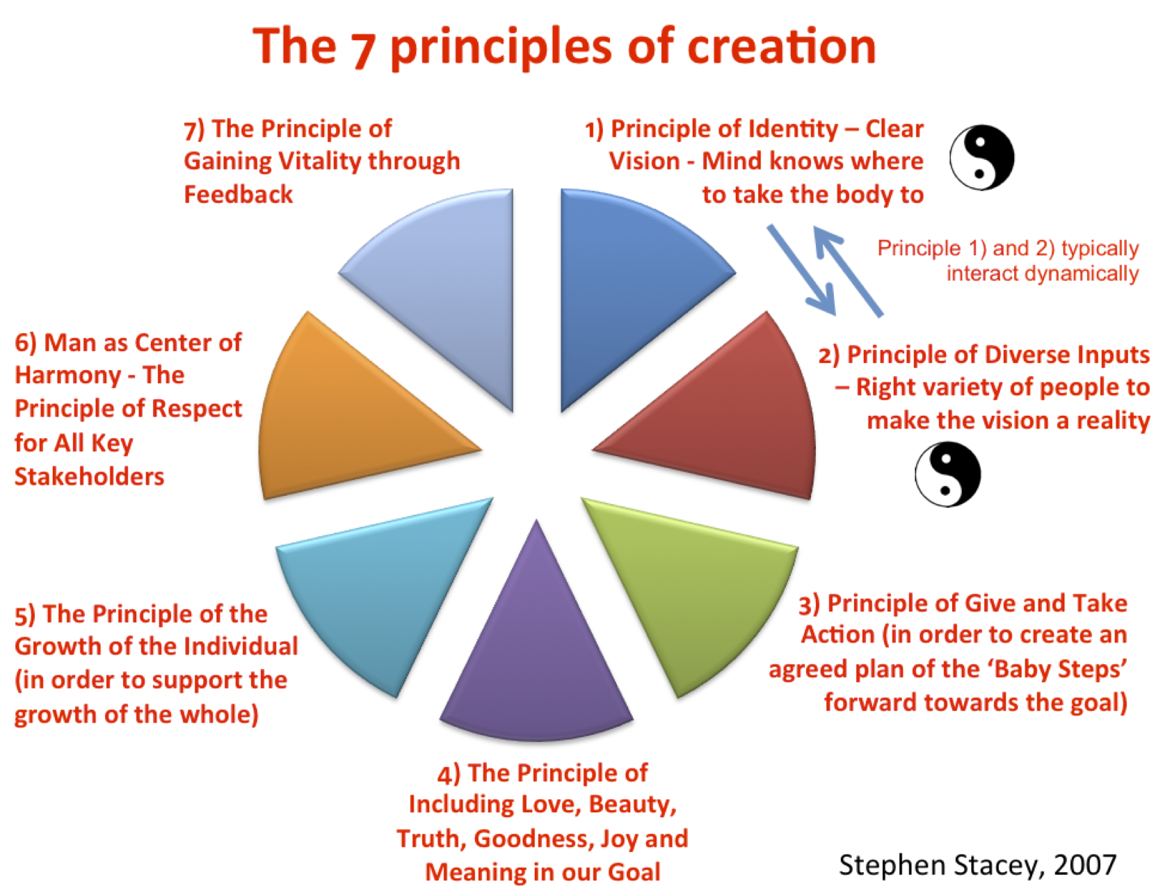 Two further comments. Firstly, men and women didn’t lose their ability to use the seven principles of creation after the fall of man. For example, Abraham used them to build a successful business. We use our common sense, our rational thinking, to derive and apply them. One of the key reasons why we understand these principles as being “common sense” is because they are intrinsically embedded within the natural world. All living species use the same goal-setting principles in order maintain health and well-being over the course of millions of years — and because we are a part of the natural world, we pick up on these principles. Well-run companies, organizations and marriages naturally develop through consistently using these same principles, not just in a static, “use once only” way, but through using them as an ongoing, dynamic, feedback loop.