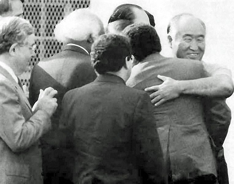 Rev. Moon welcomed by clergy after release from Danbury prison in August 1985.