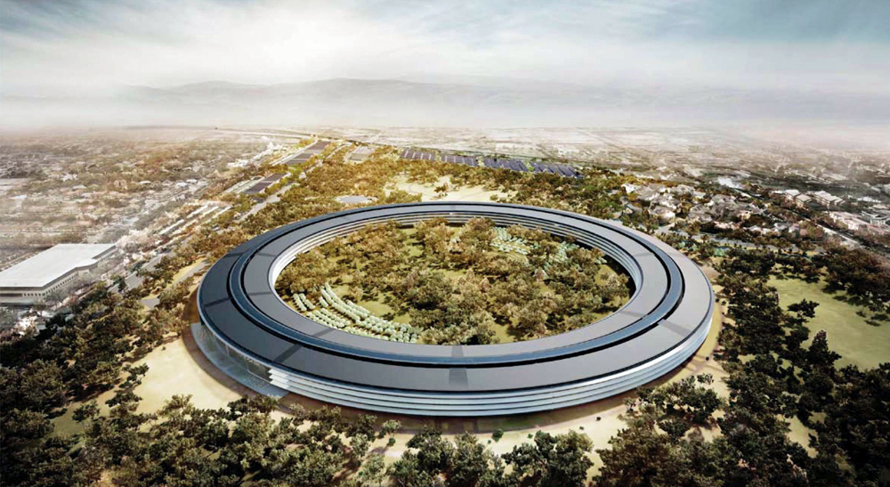 (Above) Apple CEO Tim Cook led a memorial service for founder Steve Jobs at its headquarters in Cupertino, CA, on October 19, 2011 (photo: Apple, Inc.). (Below) Apple’s new “spaceship” headquarters, Apple Campus 2, will house up to 13,000 employees when completed in 2016 (photo: Foster & Partners).