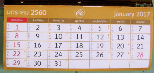 A common Thai calendar showing the Western year, 2017, and Buddhist year, 2560.
