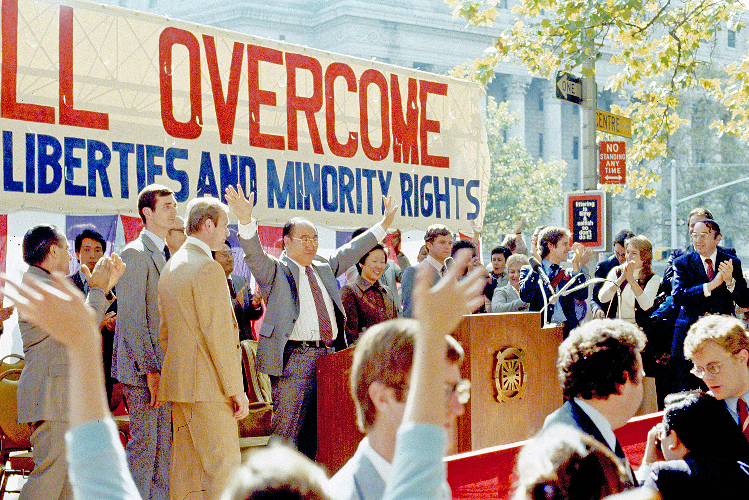 Reverend and Mrs. Moon at a rally of supporters outside the federal courthouse in New York on October 22, 1981.