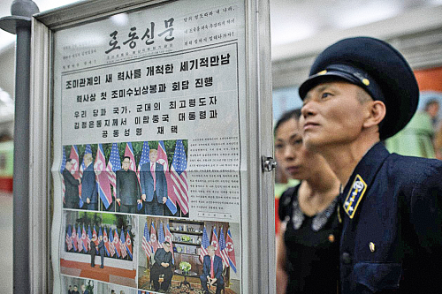 North Korean subway riders read the front page of the June 13, 2018 edition of the main newspaper, Rodong Shinmun, covering the Singapore Summit.