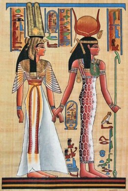 Egyptian Goddess Hathor (right) — who personified the principles of joy, music, feminine love, and motherhood — guiding Queen Nefertari.