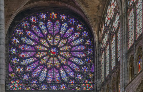 Photo at top: The stained glass rose window of the north transept of the Basilica of Saint Denis in Paris, France (source: Wikimedia Commons).