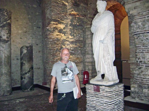 The author by a statue of a priest in the ruins of the Thermes de Cluny in Paris.