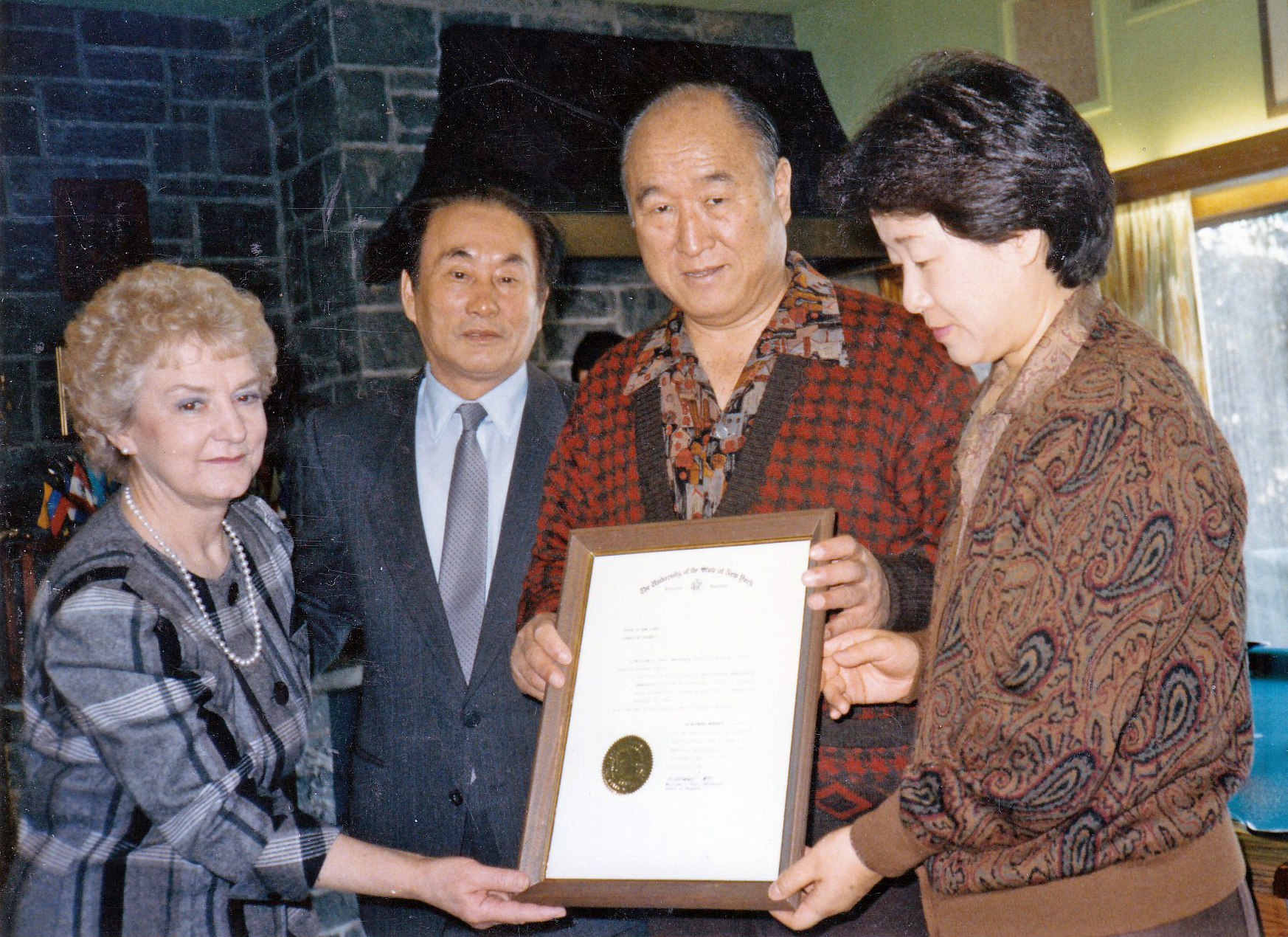 UTS Academic Dean Therese Stewart with Seminary President David S.C. Kim and Founders Father and Mother Moon holding the Absolute Charter, which was received in 1990.