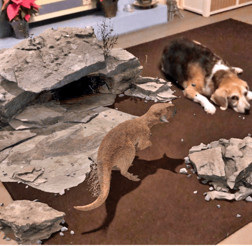 I have always had a fascination for dinosaurs. When the first “Jurassic Park” movie came out, I took our then 11-year old daughter to the very first showing the night it came out. So when I discovered that there were augmented reality (AR) apps for my phone that would allow me to have a dinosaur in my house or yard, I naturally tried several of them out. Augmented reality places digital objects “in” our external physical reality, which can be viewed and interacted with in three-dimensional space on a phone or with a special headset or glasses. My dinosaur AR apps allow me to squeeze a T. Rex into my living room, or have him romp in my yard. I have included a photo of our new pet, a psittacosaurus, with our dog, Dee. Dee doesn’t seem so impressed and doesn’t want to play.