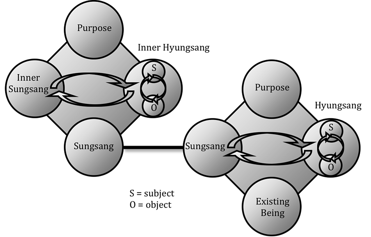 The image below is my adaptation of this two-stage structure to an existing being. I indicate the compound nature of sungsang and hyungsang by relationship within both the hyungsang and inner hyungsang. In a human being, our physical body would emerge in the hyungsang, and our spirit body in the inner hyungsang.
