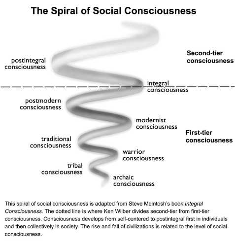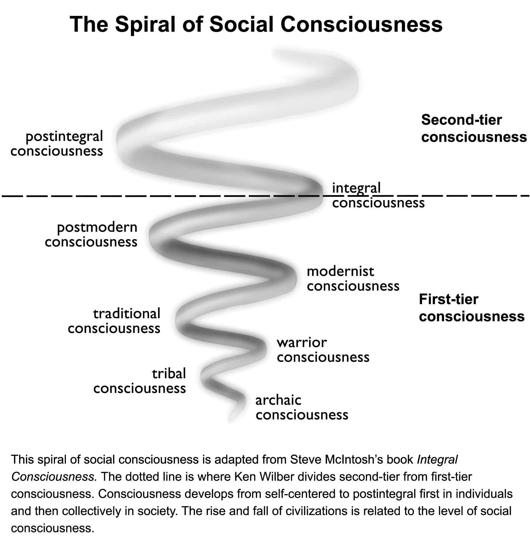 Human society has evolved from hunter-gatherer societies to large complex civilizations with many social institutions in each sphere. Human consciousness has developed with this evolution of society. The evolution of this consciousness is the centerpiece of Wilber’s Theory of Everything. While this evolution has an overall development we can trace over the last 12,000 years, it is not determinate or guaranteed. Civilizations have risen and fallen based on social consciousness, motivations of leaders, and the nature of social institutions.